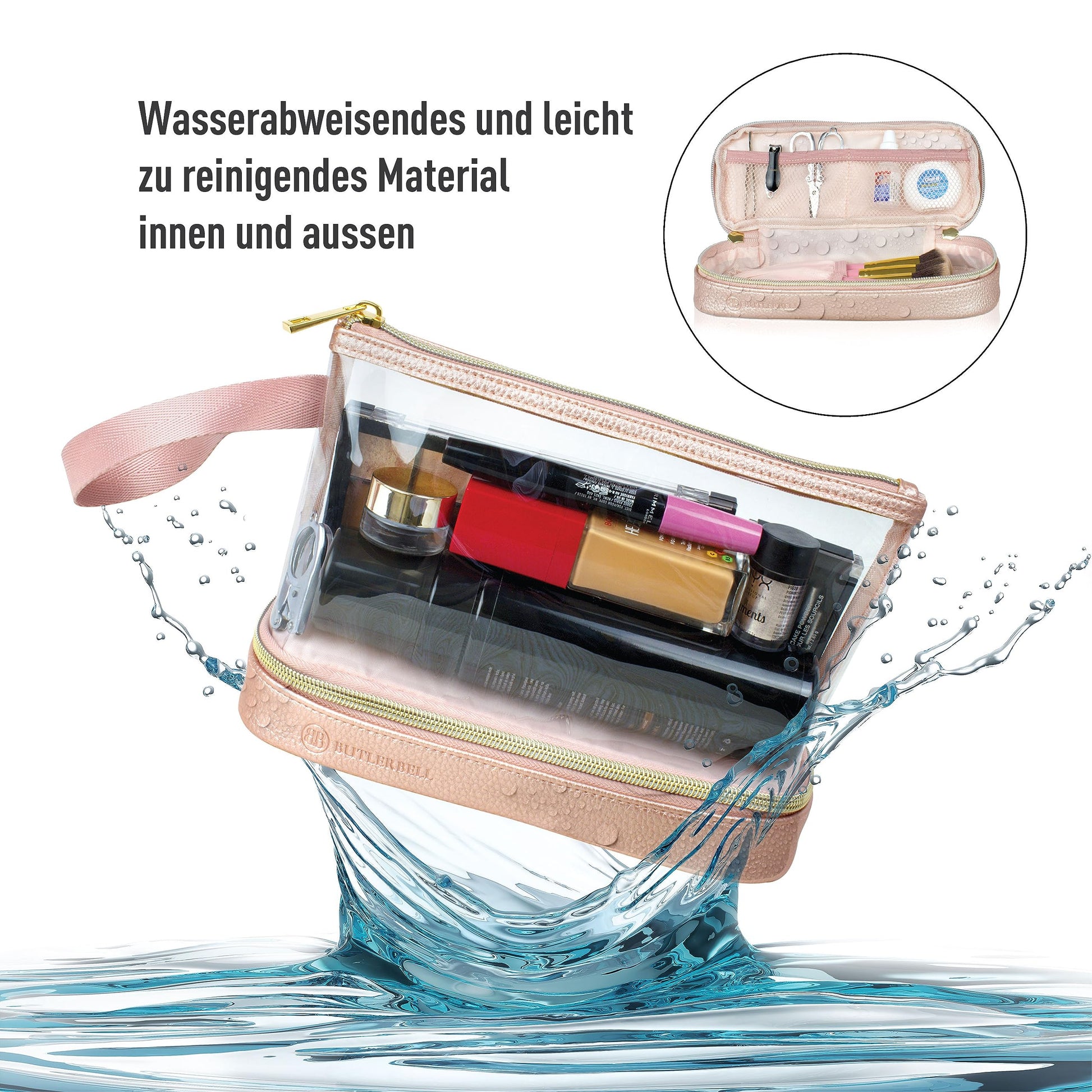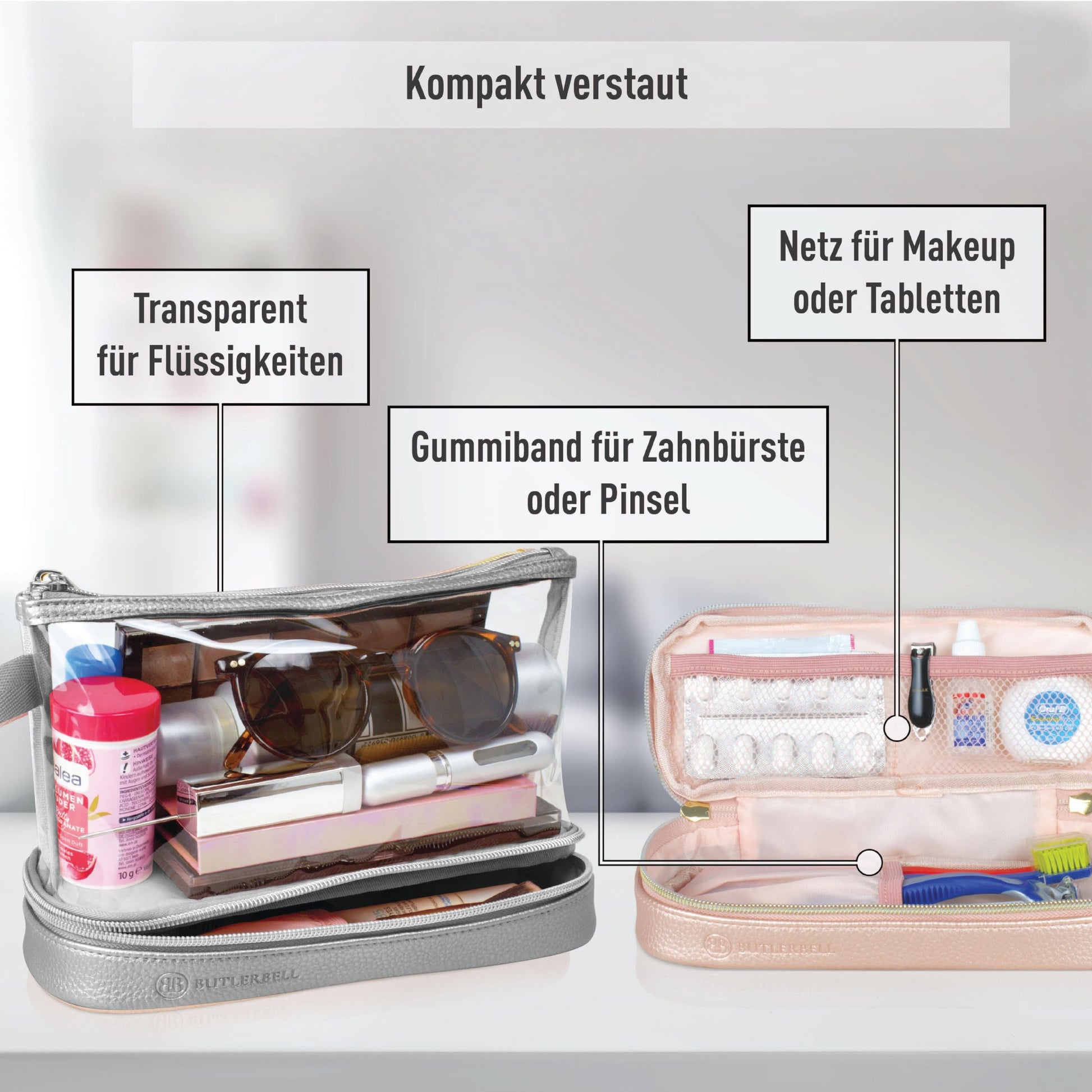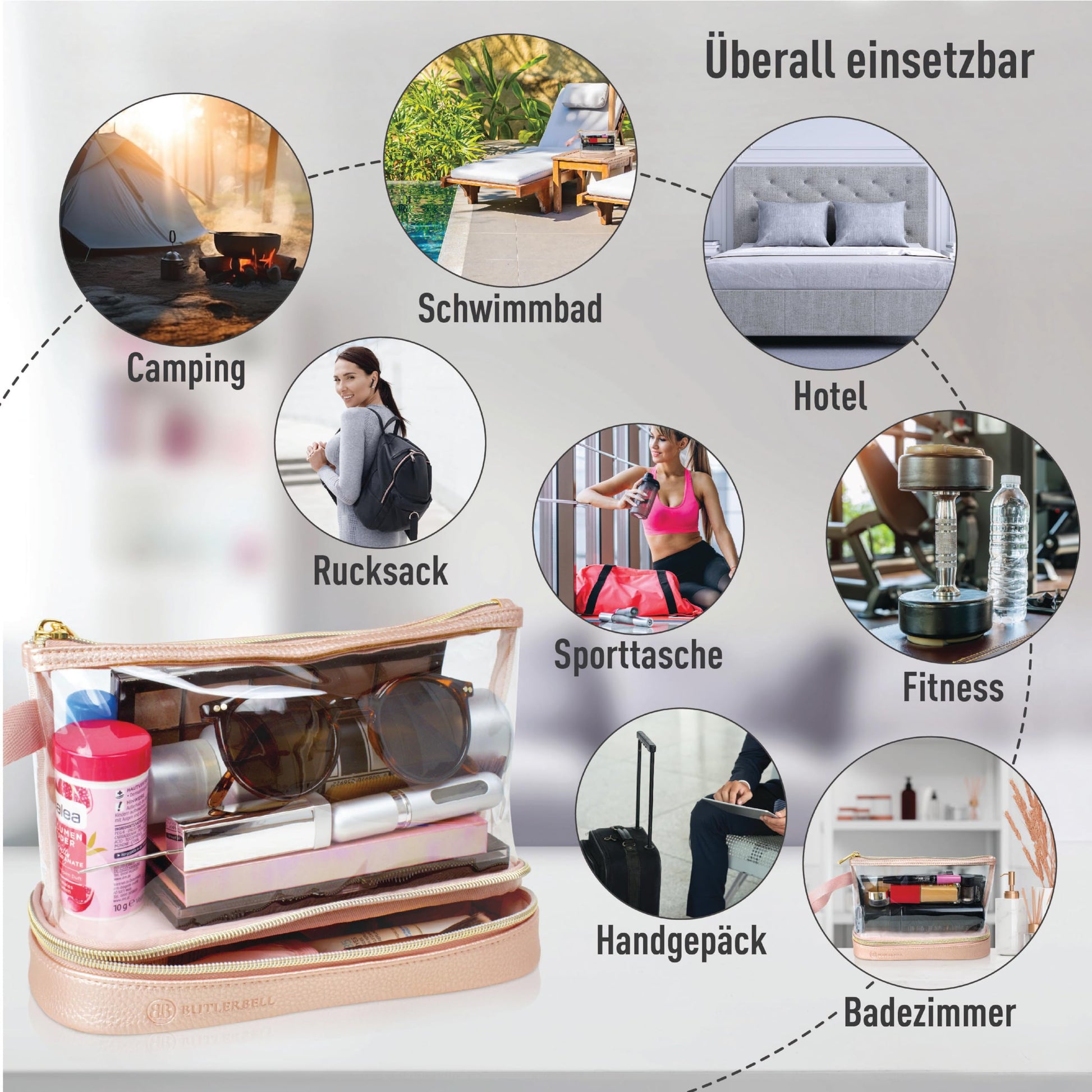 - 𝗣𝗥𝗘𝗠𝗜𝗨𝗠-𝗠𝗔𝗧𝗘𝗥𝗜𝗔𝗟 - BUTLERBELL Reise-Kosmetiktasche ist aus durchsichtigem PVC-Material, weich, umweltfreundlich, wasserdicht und reißfest. Premium veganes Leder für großen Stauraum und mehr Privatsphäre. Hochwertige Reißverschlüsse für runden das elegante Design ab. Außerdem gibt es die Schlaufe zum Aufhängen der Tasche.